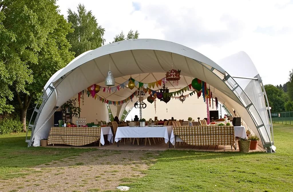 Арочный шатёр размером 10×10 метров — это вмещающая до 70 человек современная конструкция для масштабных мероприятий на свежем воздухе или в помещениях. Эффектная арочная форма придаёт вашему событию стиль и современность, а также обеспечивает надёжную защиту и комфорт для гостей при любых погодных условиях.