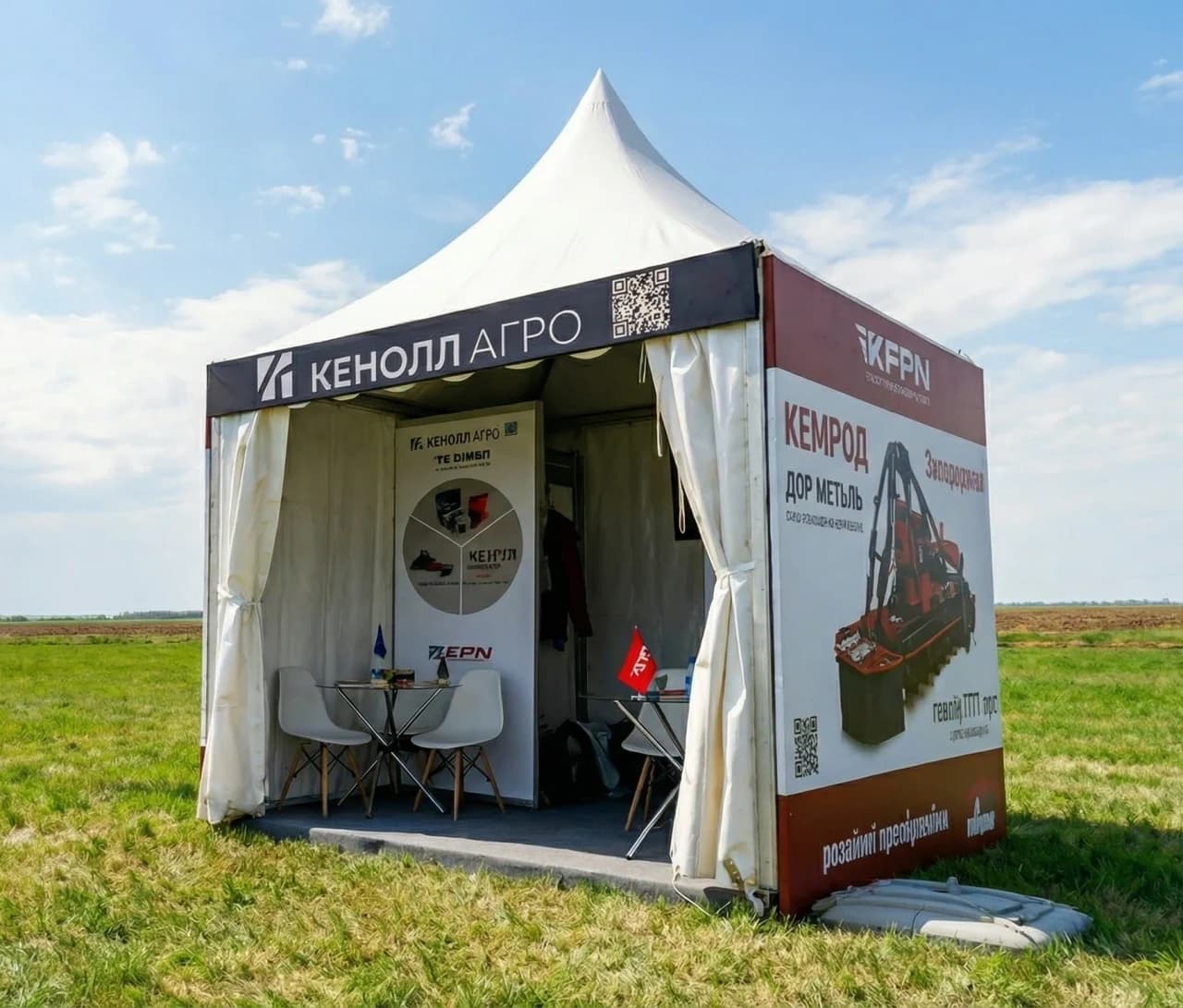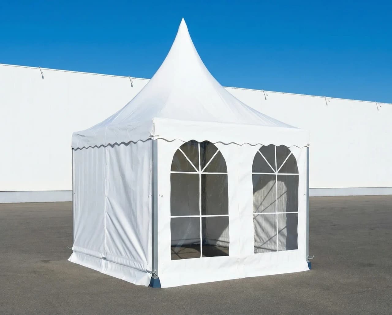 Шатёр Пагода — это современная квадратная конструкция с переменным уклоном кровли (≈ от 18° до 70°), выполненная в характерном стиле пагоды. Безопорная ширина стены — 3 метра, базовая высота стены 2,5 метра (можно изменить по индивидуальному запросу). Благодаря компактности шатёр быстро и легко монтируется на любой ровной поверхности и не требует сложной подготовки площадки.